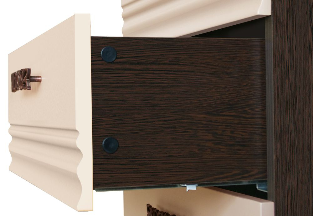Каркас изделий производится из ЛДСП, торцы обработаны кромкой ПВХ. Фасады выполнены из МДФ. Набор мебели для спальни «Катрин» выполнен в классическом стиле. Оригинальный дизайнерский рисунок дополняется фрезеровкой. Высокую надежность и длительный срок эксплуатации изделий обеспечивает используемая европейская фурнитура. Мягкое изголовье кровати создает дополнительный комфорт для отдыха. Шкафы и кровати оснащены регулируемыми по высоте ножками и опорами, которые позволяют скорректировать неровности пола при установке модуля. Ортопедическое основание кровати позволяет телу принимать правильное положение во время сна и отдыха. Изящная спинка придает легкость.