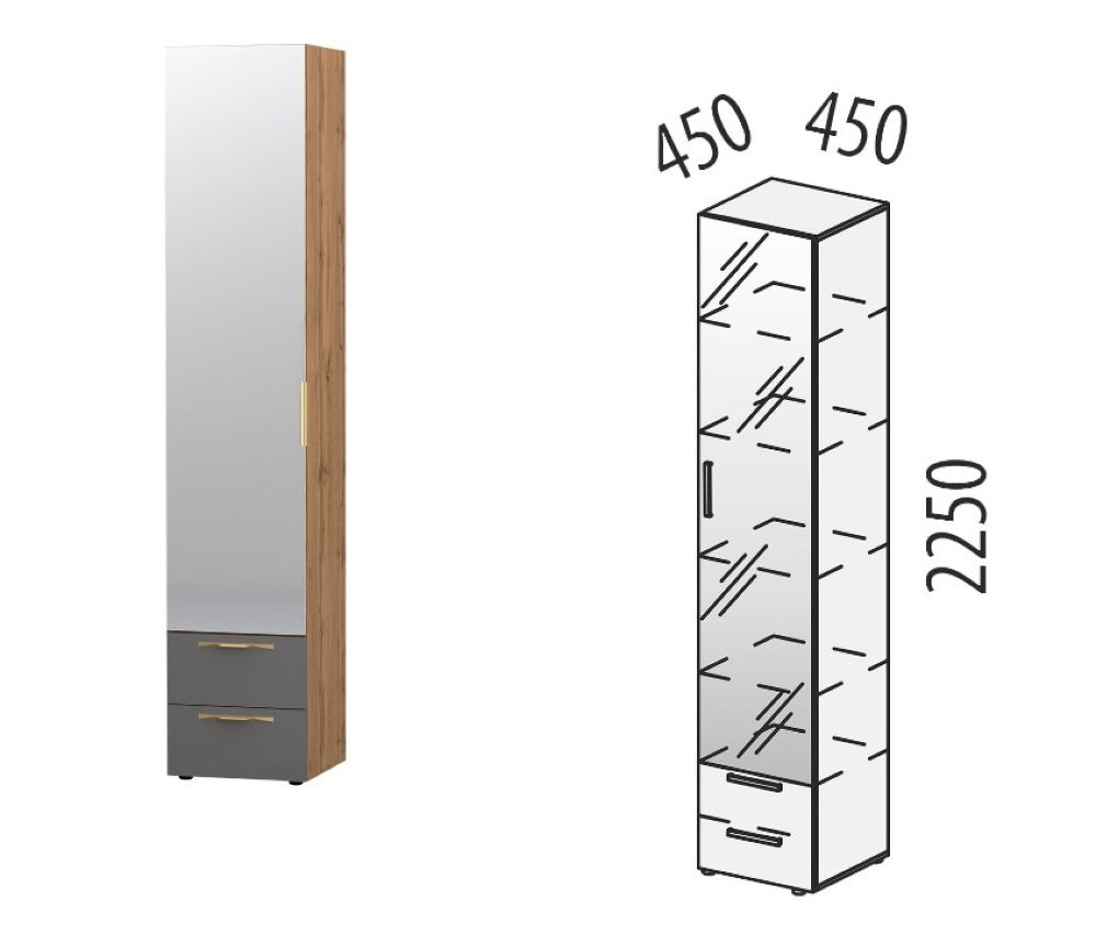 Шкаф «Монако 402.06» является частью модульной серии «Монако». «Монако 402» – образец элегантного стиля и утонченного вкуса. Сочетание матовой графитовой поверхности фасадов с благородной древесной текстурой «Дуб Вотан» создает особую атмосферу гармонии и комфорта.