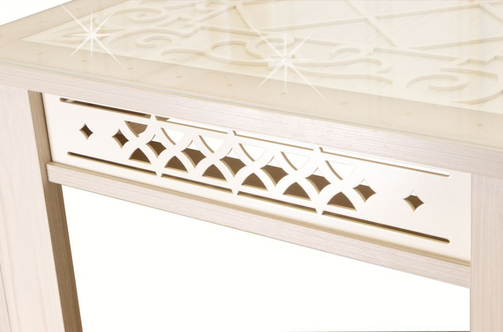 Журнальный стол «Агат 30.10» – это современный взгляд на классический интерьер. Он сочетает в себе многообразие декоративных деталей: ажурный декор, блеск глиттера и кристаллов, резные царги. Главной изюминкой стола являются ажурная МДФ-вставка под стеклом и резное подстолье, их сочетание делает стол легким и изящным. Кристаллы Swarovski® под стеклом и глиттерный рисунок на рамке столешницы создает чарующее мерцание, которое добавит интерьеру тепла и света. Закаленное стекло на столешнице обеспечивает длительную и безопасную эксплуатацию.